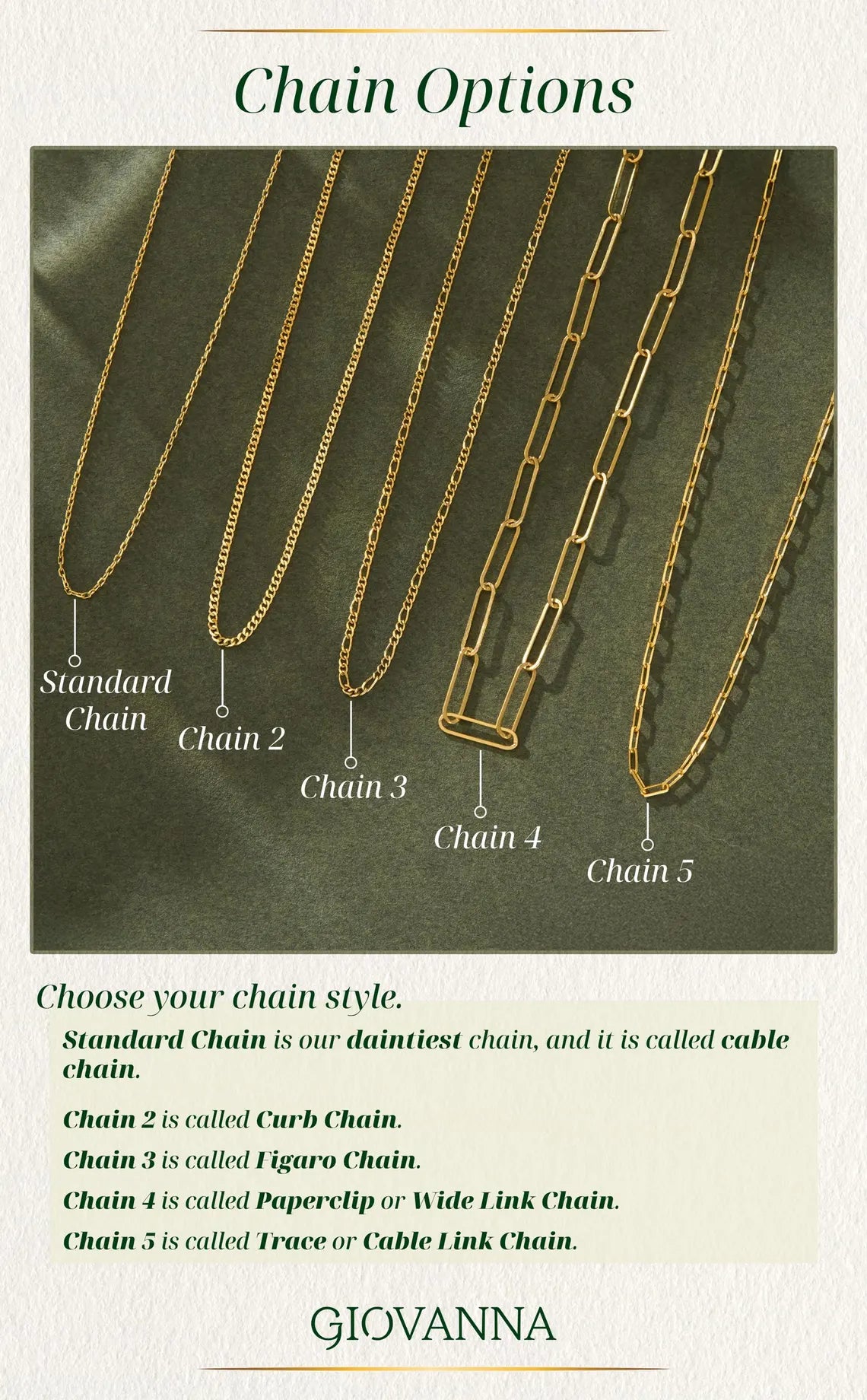 𝗖𝗵𝗮𝗶𝗻 𝗢𝗽𝘁𝗶𝗼𝗻𝘀: We offer a wide variety of 5 different chain types. (Cable Chain, Curb Chain, Figaro Chain, Paperclip Chain, Cable Link Chain)