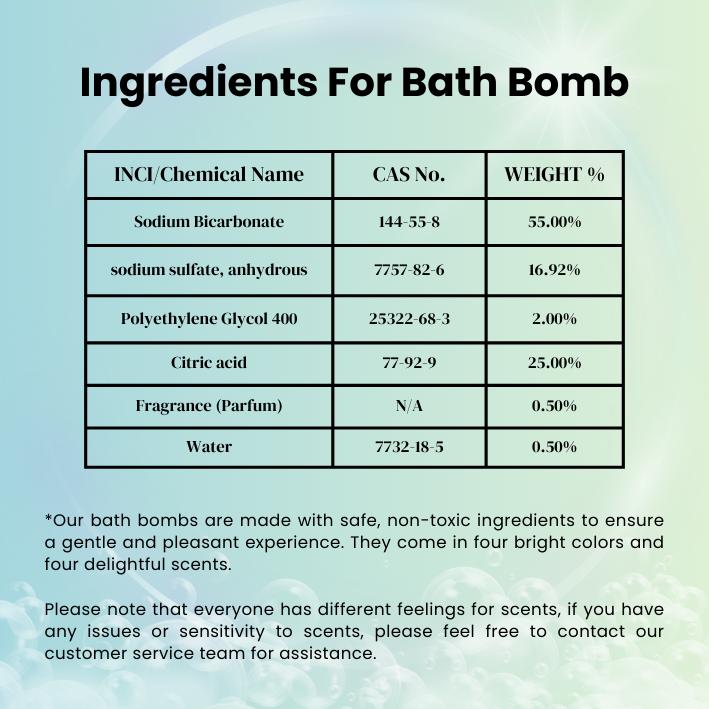 Colorful Fragrances: Each bath bomb's unique color corresponds to a distinct and delightful fragrance. From the sweet aroma of pink strawberry - scented bath bombs to the fresh and clean scent of blue ocean - inspired ones, every color offers a different aromatic journey, enhancing your bathing pleasure.